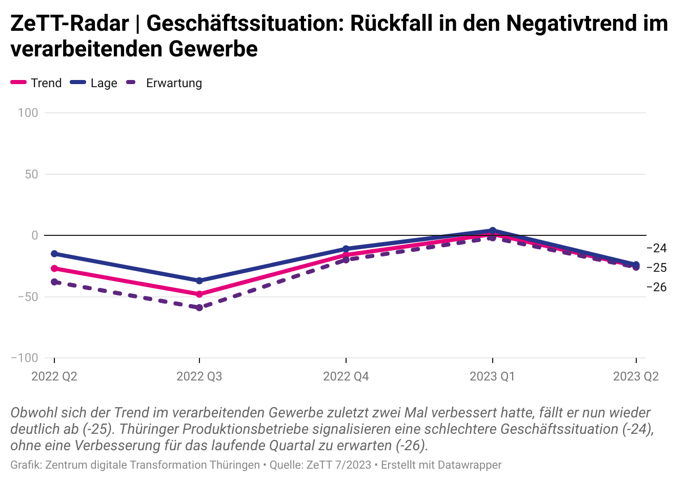 Der ZeTT-Radar-Trend für den Arbeitsumfang weist vor allem im Industrie- und Baubereich auf weniger Aufträge und Personalabbau als noch im Vorjahr hin. Ausnahmen bilden die Dienstleistungs- und noch etwas deutlicher die Digitalwirtschaft, wo nach einem zweiten Quartal mit hoher Auslastung wieder ein gutes drittes Quartal erwartet wird. Zudem signalisieren die Unternehmen der Digitalwirtschaft eher einen Personalaufbau von Juli bis September – ein kleiner Lichtblick für Thüringens Wirtschaftsaussichten. Bei den Digitalisierungstrends finden sich Unterschiede: Während die Bauwirtschaft Ausgaben für digitale Services und Produkte senkt, investieren Industrie, Dienstleistungen und Digitalwirtschaft weiter.